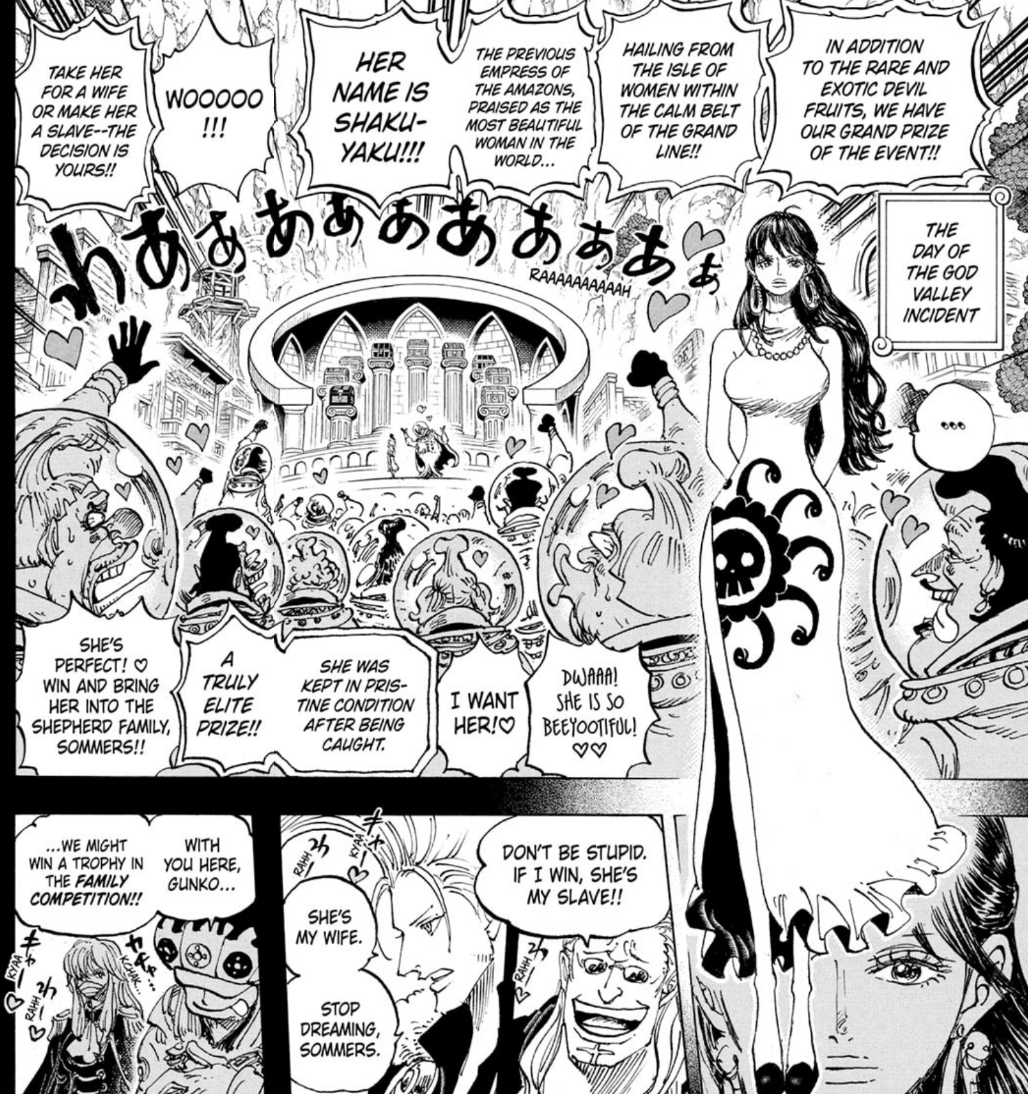 And so, the day of the God Valley Incident finally starts for good, as we see the horrors of the Genocide Tournament being put on display. The prizes include several coffers, including the one where Shanks would be hidden inside of, but also a set of unique slaves serving as either hunts or prizes. Inside of the chests there should be devil fruits, at least the Nikyu Nikyu no Mi that would be eaten by Kuma and the Uo Uo no Mi, Model: Seiryuu that would be eaten by Kaidou (though I wonder if the other chests also heard other valuables that aren’t fruits given how there’s 9 of them here, unlike the 6 we saw during Kuma’s flashback, but I wonder if there’s a reason for it). But the crown jewel has to be Shakky herself, the treasure of Hachinosu Garp mentioned being stolen all the way back in 1096, being offered to the winner of the tournament.