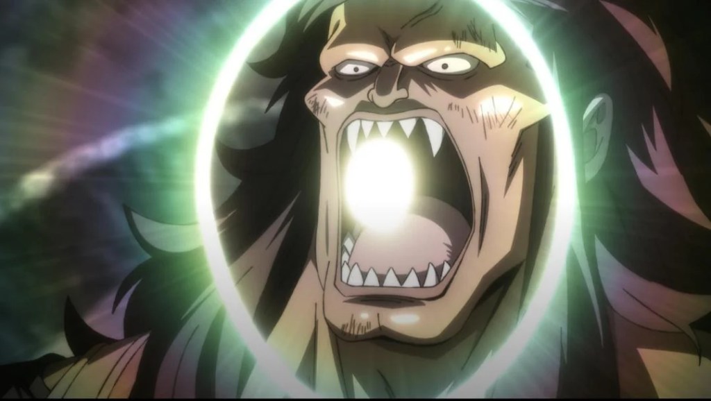 Still, let’s take a step back… what was that laser beam all about? One may associate it with the laser beams of the Pacifistas, but I don’t think that’s the case. For one, the beam doesn’t have the same shape and shine that the Pacifista lasers did, as those were actual replicas of Kizaru’s powers thanks to Vegapunk’s research, and had a more distinct glint to them when firing. But more than anything, the Pacifista project wouldn’t even happen for another three decades, so it clearly can’t be it as Vegapunk hadn’t even researched such technology. This however bears a resemblance to another familiar power but one you may have likely forgotten about… that of Howling Gab.