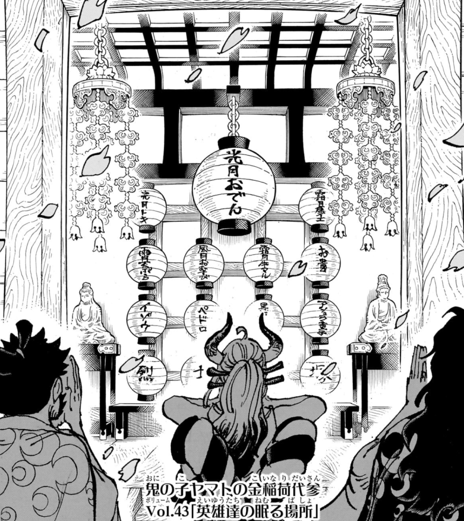 Shockingly though, this time we get both a color spread and a cover story, which is pretty unprecedented from Oda himself, as the only other time I can recall one was the time we had a guest color spread by one of the Toei animators. In this one, we see Yamato, Kin’emon, and Momonosuke praying at Oden’s shrine, the latter two wearing a kimono with a kouzuki, or moon, pattern on them. Within the shrine are several lamps, like those of the fire festival, and they each hold the name of a different person on them. The central and biggest one of course reads “Kouzuki Oden” (光月おでん). To the left is “Kouzuki Toki” (光月トキ) and to the right is “Shimotsuki Yasuie” (霜月康イエ). On the row below are the remaining daimyo who were said would be buried here, Shimotsuki Ushimaru (霜月牛マル), Uzuki Tempura (雨月天ぷら), and Fuugetsu Omusubi (風月おむすび), as well as a figure simply called here as “O-Taka” (お貴). This person is in fact Hyougorou’s wife, who was only named in a recent vivre card databook, so it would be pretty hard for anyone to know it’s her if you don’t know your Wano trivia, but it makes sense she was honored here considering how much she meant to Oden. And on the next row are Izou (イゾウ), Asyura Douji (アシュラ童子), and Pedro (ペドロ), which warms my heart. Interestingly, one of the lanterns partially covered by Yamato’s horns reads as “Kuro” (黒), which may suggest it’s in honor of a Kurozumi, and thus may potentially be in name of Kurozumi Kanjuro (黒炭カン十郎). Even though he had betrayed his family perhaps they felt that he too deserved to rest alongside them. But Oda wishes to keep this detail subtle which is why he covered it. Below them are a bunch of extra kanji, and while the two central ones are covered by Yamato, the ones on the right and left read as “tsuka” (塚) and “retsu” (烈) which both mean “burial site” and “honorable death”, which make sense as kanji to adorn the grave of heroes. Furthermore, on both sides are a pair of Buddhas, which may I remind still exist in One Piece, and we know that Oden believed to some extent in Buddhism given a line he mentioned at the end of 966.