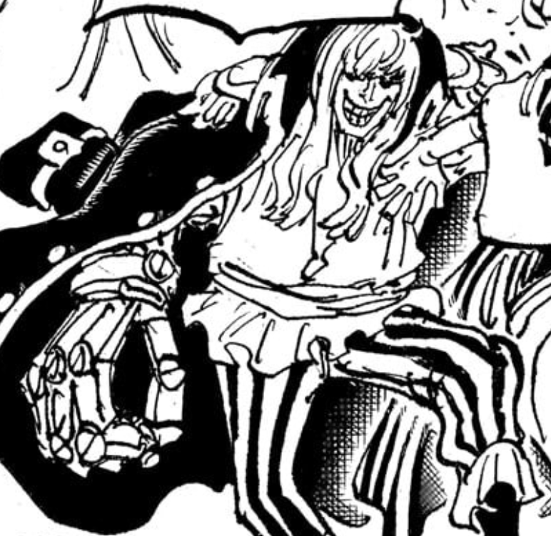 We see the Rocks Pirates rushing towards Shakky, including Ganzui, Gloriosa, Gill Bastar (though interestingly unlike previously seen on God Valley, he only has two arms here), Kyou and Shiki bantering once more, and Captain John, with what might be Barbel behind him too. Interestingly though, John appears to have a metal arm, much like that of Kid. What’s odd is that this seems to also be a prosthetic, but if you go back to Chapter 1096, you’ll realize that John’s right arm was actually covered by a sound effect, so we didn’t see this detail. In Thriller Bark as a zombie, John had both of his arms, but keep in mind that Hogback’s zombies were all stitched together from different parts, so if John was missing an arm, it makes sense Hogback gave him back another arm. Though at the very least, earlier in this flashback, he did have his right arm, so this is something that must’ve happened over the last couple of years or so.