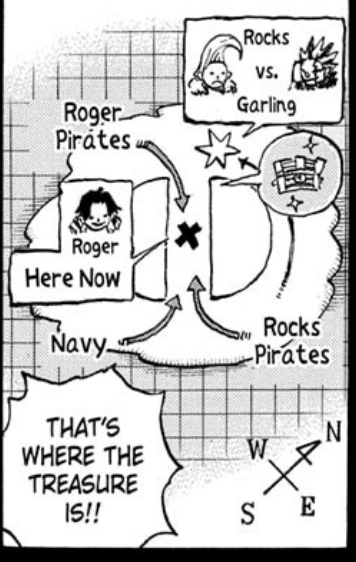 We get a simplified map of God Valley, which helps us better orient ourselves with all the chaos going on. At the center is of course the titular Valley, which is where Shakky was being held, which cuts across the island from the north-western side to the south-eastern side. From the west came the Roger Pirates, entering into the valley from the top side, while from the east came the Rocks Pirates, entering the valley from the lower side, with the Marines pursuing them from the South. On the other hand, however, Xebec went around on the side of the mountain on the north as he was instead looking for Eris and Teach while all the other Rocks were busy going after Shakky. There it seems he came up against Garling, who appeared to be on the north-western entrance to the Valley right next to the treasure cache, as he was likely guarding it from pirates to ensure they didn’t steal them from the Celestial Dragons, particularly as many would’ve been meant for him if he was going to emerge as the Champion. As we will see later though, for being quite the champion, Garling couldn’t quite stand up to Xebec, which is why the treasures were left unguarded. It does seem though from what we see later in the chapter that there are two treasure storage warehouses, listed as number one and two. In the first one is where the devil fruits are found, where on the other one all the gold and treasures are found instead, being located right behind the “game stage” (ゲームステージ), what served as the stage for presenting the tournament. Judging by their location, it would seem the second storage warehouse is the one indicated here on the map, whereas the first one with the devil fruits is slightly more in land.