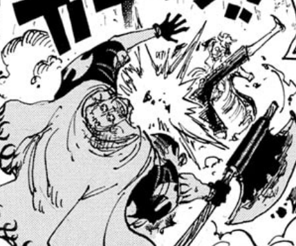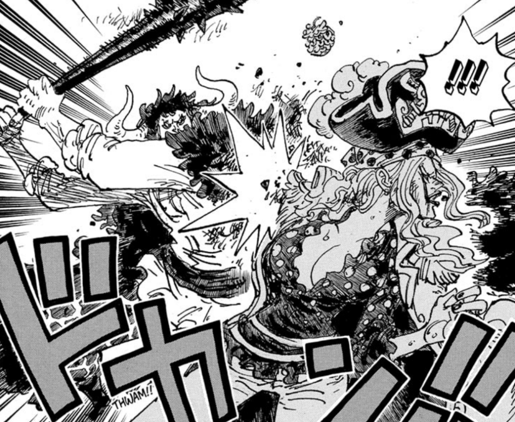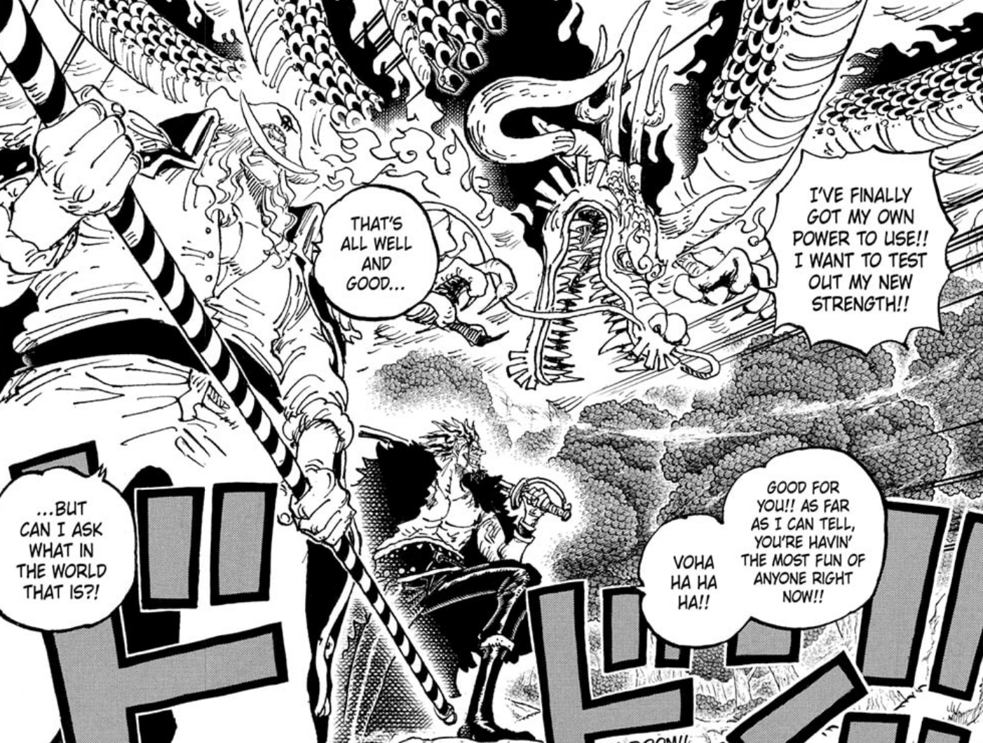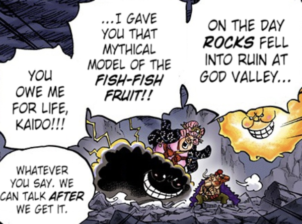 Still, dragon Katakuri does not come to pass, as Kaidou comes in and knocks Linlin straight in the face, all to attain the fruit for himself. Linlin is enraged, clashing with Kaidou and causing a large explosion with some haki lightning. This does reframe quite a bit of what Big Mom described us of this event in Chapter 999, however: “I still think of you like a little brother!! On the day Rocks fell into ruin at God Valley, I gave you that mythical model of the Uo Uo no Mi!! You owe me for life, Kaidou!!!”. Her line of “I gave you that fruit” though can also be more appropriately translated as “I let you have that fruit”, as Big Mom was basically saving face and acting like it’s only thanks to her that Kaidou got the fruit and he needs to pay her back for stealing it. Particularly as in 907 Big Mom asked to have Luffy before Kaidou by telling him “And let’s not forget, you still owe me big time, Kaidou.” to which he replied “That was in the past!!” but she remarked “But it’s a lifelong debt…”. Again, we were clarified in 999 that this was the fruit that Kaidou ate, so it seems that Big Mom was bitter enough about this moment that she kept nagging Kaidou about this debt for the rest of their lives.