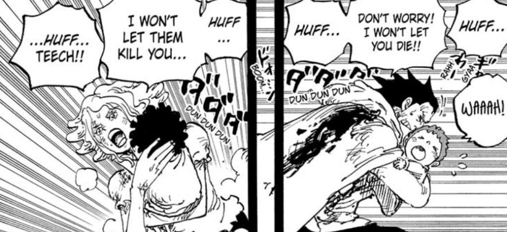 As Eris and Teach run away though, Teach looks back at this father and will remember his efforts here. And we see a very clear parallel between Dragon running away with a baby Shanks and Eris running away with a baby Teach, two different figures who would oppose each other in the future as two of the most key pivotal players, one helping give rise to Luffy to bring the Dawn and the other one wishing to usurp Imu’s control. One of them would even further scar the other one, interlocking their fates for long to come.