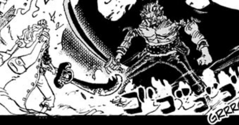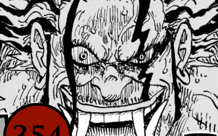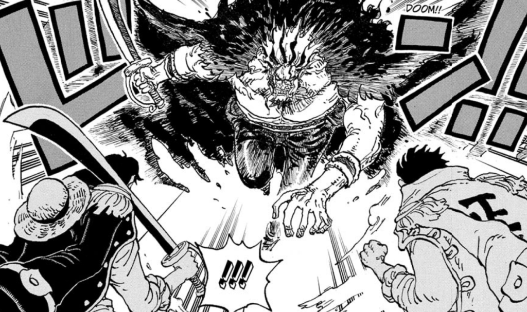 Despite the opposition that Xebec has put up though, Imu ultimately fully converts him with Domi Reversi. The process is intense, as the sound effect “bari bari” (バリバリ) can be read around them, which is the cracking of thunder caused by powerful haki, seemingly involved in this move to more forcibly convert Xebec. Beyond the teeth, Xebec now gains also flaming eyes, large wings forming from his cape, and his size also considerably increases, just as we had seen with the giants, towering even over the likes of the 8.8 meter tall Linlin. He swiftly swats away both Kaidou and Linlin, and has an intense clash against Newgate, whose cracking is so powerful that it collapses one of the two halves of the mountain composing the eponymous God Valley. It’s implied that Xebec emerged victorious from this clash, though I wouldn’t really count Newgate out, nor would I count Kaidou or Linlin out after just a hit. I wouldn’t be surprised if they came back later on to help join in on the fight in helping put their captain to rest.