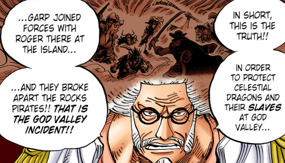 At last, the duel begins with Rocks leaping toward Garp and Roger, and if you notice, their poses are faintly reminiscing of the picture that Sengoku showed us in his explanation of God Valley, with Roger holding his sword over him and Garp readying to charge his fist, though in that original picture Oda had accidentally depicted Roger with the wrong hat and his mustache (as he also did in the storyboards he provided for Film RED), before changing him to look younger and have the straw hat instead. But still, it’s unbelievable to think that this sight which we had been told about 6 years ago is finally coming to play in front of our eyes. The God Valley Incident begins right now!!