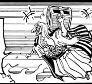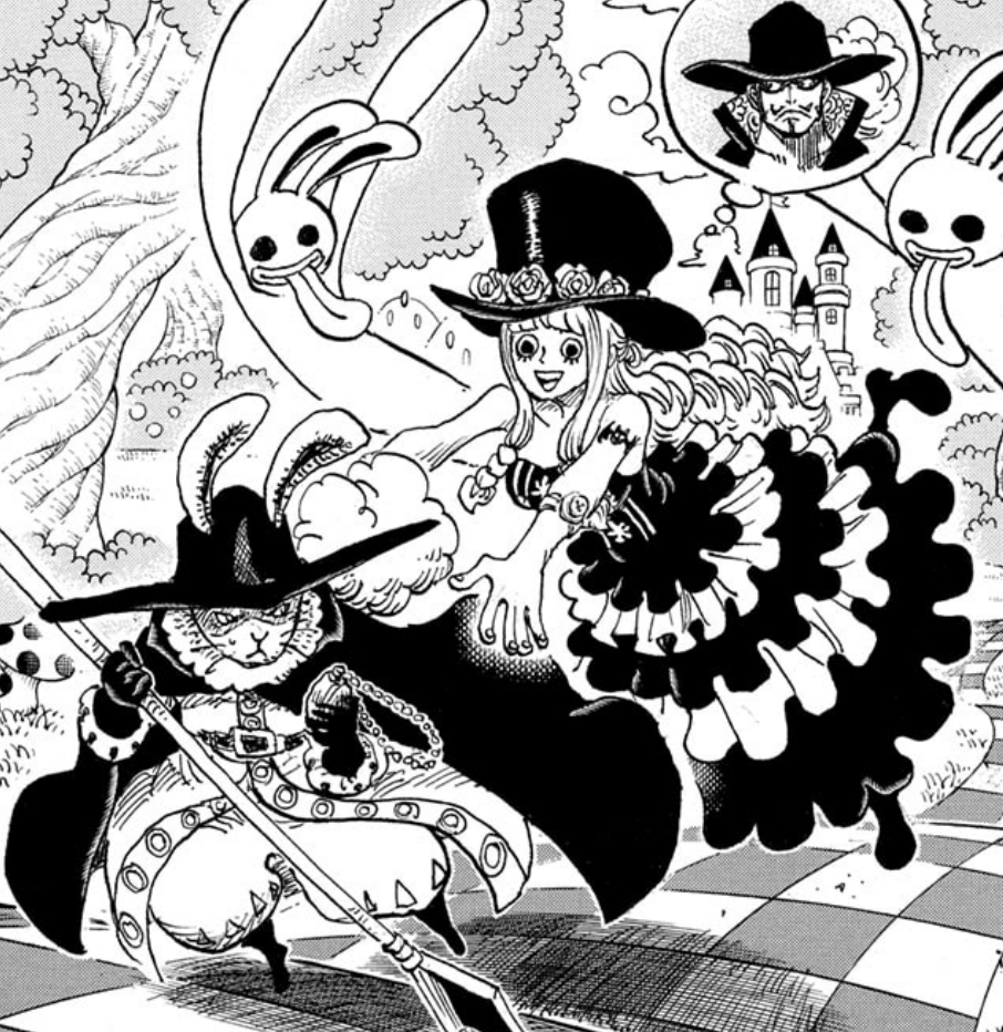On the cover, Perona chases after a rabbit because it reminds her of Mihawk. The scene is likely an homage to Alice in Wonderland, with the rabbit checking the clock intended as a reference to the iconic scene at the start of the book where Alice chases after a rabbit who is late. In this case though, the rabbit is someone we’ve already seen before, and it’s a member of the Big Mom Pirates called Randolph. Known as the “Crane Rider”, Randolph is a rabbit homie serving under the crew, being a rabbit that began acting as a human due to posessing a soul within him thanks to the powers of the Soru Soru no Mi (Soul Soul Fruit). He was originally seen gathering ingredients for the tea party during Big Mom’s introduction and later clashed with Carrot in the Seducing Woods before ultimately being defeated by Chopper and Carrot inside Brûlée’s house in the Mirro-World.