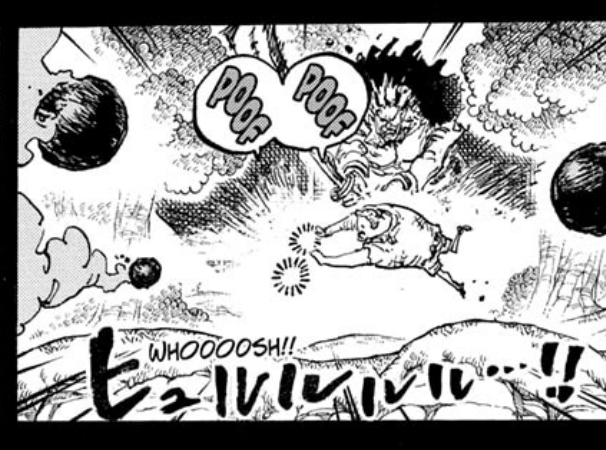 Many around the island react to the chaos, such as the Celestial Dragons scrambling to get out. We see one of them uses the first person pronoun “wachikira” (わちきら), which is a very archaic pronoun that was mostly used by females such as geisha, but in the case of a celestial dragon it just comes off as pompous and even borderline childish. The Roger Pirates meanwhile are also escaping from the island with treasure in hand, and you may notice that from one of the chests the writing “zzz” can be seen, showing that’s the chest inside of which Shanks is sleeping.