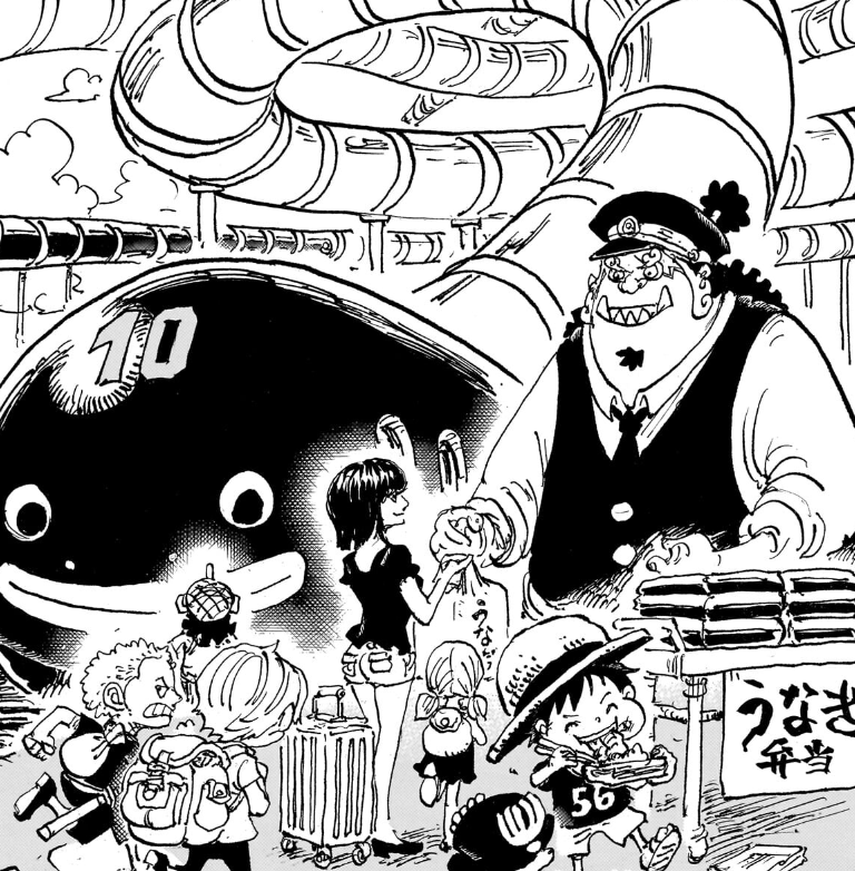 On the cover, we see Jinbe working at an eel train station, selling bento to the rest of the straw hats. Of course the idea of an eel train is very mucha Oda surrealism, but the idea of selling bento boxes at a train station is very much a mainstain of Japanese culture. As you may know, a bento is a lunch box stuffed with pre-prepared food, incredibly common at convenience stores and some shops as a way to get a balanced and healthy meal without the need to cook something complex at home or at a restaurant. These are common with children, especially as it’s tradition for parents to make them bento they can take to school so that their lunch is something healthier than just a sandwhich, but they’re also particularly popular at train stations, being known as “ekiben” or fundamentally “station bento”. This is because a lot of people who are going through train stations, particularly those that cross to other cities far away within the country by taking the Shinkansen, will eat on the train to make sure they don’t waste time, while still eating a balanced meal. So in this case, Jinbe is selling the group station bento for the long journey ahead. The grim aspect however is that as the kanji reads, these are うなぎ弁当 (unagi bento), or in other words eel bento, a common bento serving but also kinda weird considering that the trains themselves are eels. Are the trains alive, however, given those eyes, or is this purely thematic? Maybe we shouldn’t think that much about it…