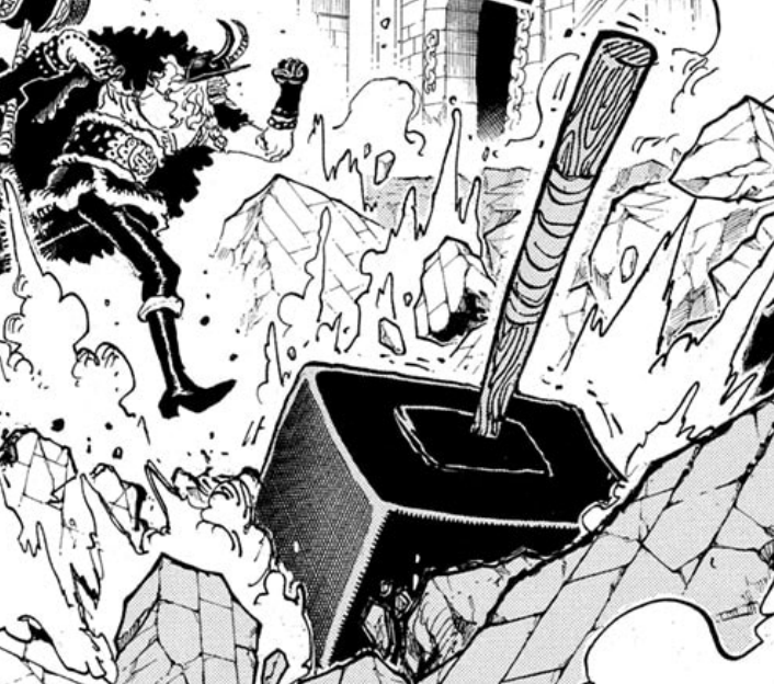 We pick off right from where we left off, where we see Ragnir, with a will of its own, trying to attack Loki, which he barely dodges. As we had thought, Ragnir is indeed a hammer that has eaten a Zoan devil fruit and attained a will of its own. And as Harald explains, the reason the fruit has gone uneaten is because Ragnir has not deemed anyone worthy of eating it in all these years, testing anyone who would dare try to eat it. This actually relates to the original myth of Mjölnir, where it was said that the hammer was only lifted by very few individuals, primarily Thor and a couple of other exceptions in some myths. This myth evolved over time into the idea that only those who are worthy may lift the Mjölnir, so Oda in this case twists the myth around to make it so that Ragnir is instead protecting the fruit and will only let those who are worthy take the fruit (although it will also let the worthy wield it). Similarly, over time the idea that the Mjölnir is incredibly heavy was also developed, reflected here in how the hammer crushes the entire floor of the room that leads to the door, though it’s possible that by its own will it was trying to shatter the floor to stop Loki.