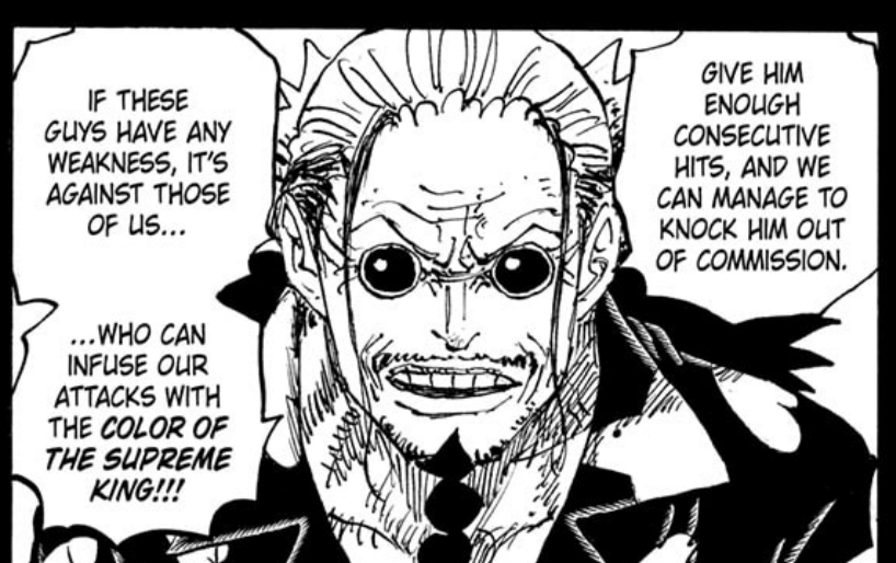 This explains why Sommers took a long time to regenerate after Gabin attacked him but ultimately recovered, because Gabin had no time to finish off Sommers as he was too busy saving the kids, so he just tried to incapacitate him for as long as possible while he tried dealing with Gunko first to free the kids. Given how we saw Saturn (though possessed by Imu, which likely powered him quite a lot) surviving a massive attack of conqueror’s all at once, it seems this has to do more with consecutive attacks than it does with a single attack all at once, though I’m sure this has a lot to vary from individual to individual based on their strength, as I imagine Harald’s immense strength is also what is making things hard for Shanks and Gabin. The latter particularly mentions that Harald himself being a conqueror’s makes it harder for these attacks to hit, which is similar to what Roger and Garp mentioned with Xebec being a difficult opponent to hurt because of his conqueror’s haki (as after all Domi Reversi involves pretty much the same system of regeneration that immortality does, it seems). So since Saturn is also a conqueror, that may be why he survived the mega attack on God Valley, and it’s likely also why Luffy struggled with hurting the Gorosei at Egghead since he did attack them a few times but not long enough to continuously keep up the assault and kill them.