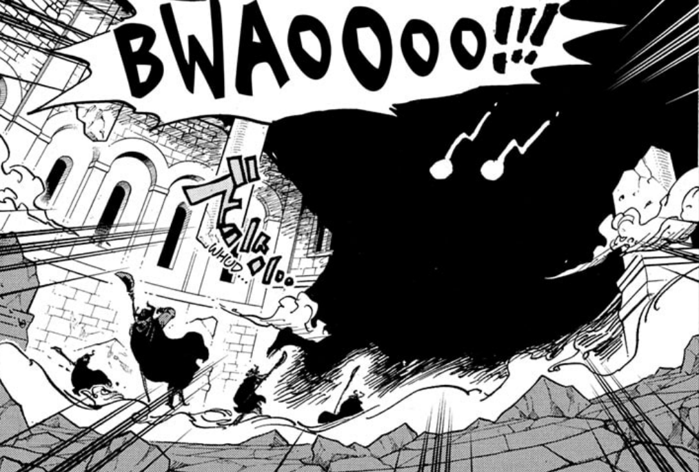 As Ragnir gives Loki permission to eat the fruit, nodding and then happy that his duty has been fulfilled, we see Loki eating it, which funnily enough is incredibly tiny due to his giant size since they were built for human measurements, but appears to have some spiky shape, appearing to look like a durian or a lychee. At that point Loki transforms, though of course Oda decides to shadow it, making it a bit tricky to determine what he transformed into, but let’s try to decipher it. It does appear to be a Zoan, as we seem to witness Loki transforming into a large creature in what seems to both be its beast form and later its hybrid form as well. In his beast form, Loki appears to grow some kind of spiky fur or horns, while his hands instead become more canine like and with nails at its ends. As he transforms he lets out a powerful growl, which reads as “baooo” (バオ), being a fairly generic animal howl to not make it too identifiable.