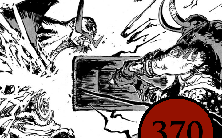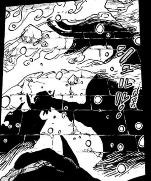 The large black silhouette with shining eyes is hard to make out, particularly as it seems to stretch upward, but it’s hard to say how much ot hte black shape is just the shadow cast by it or if this is an accurate outline, as most we can really tell apart is some kind of claw at the bottom left. In the next panel however we see the silhouette running through the castle and it appears to be running on all fours, suggesting it’s a quadripedal creature. The claws can be more clearly seen later, as Loki slashes Harald and leaves large claw marks on his body. These marks actually match those seen in the throne room many chapters ago in chapters like 1139, which we pointed out all the way back then could point to the idea of Loki’s fruit being some kind of mythical Zoan that left those claw marks.