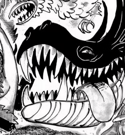 As Ragnir gives Loki permission to eat the fruit, nodding and then happy that his duty has been fulfilled, we see Loki eating it, which funnily enough is incredibly tiny due to his giant size since they were built for human measurements, but appears to have some spiky shape, appearing to look like a durian or a lychee. At that point Loki transforms, though of course Oda decides to shadow it, making it a bit tricky to determine what he transformed into, but let’s try to decipher it. It does appear to be a Zoan, as we seem to witness Loki transforming into a large creature in what seems to both be its beast form and later its hybrid form as well. In his beast form, Loki appears to grow some kind of spiky fur or horns, while his hands instead become more canine like and with nails at its ends. As he transforms he lets out a powerful growl, which reads as “baooo” (バオ), being a fairly generic animal howl to not make it too identifiable.
