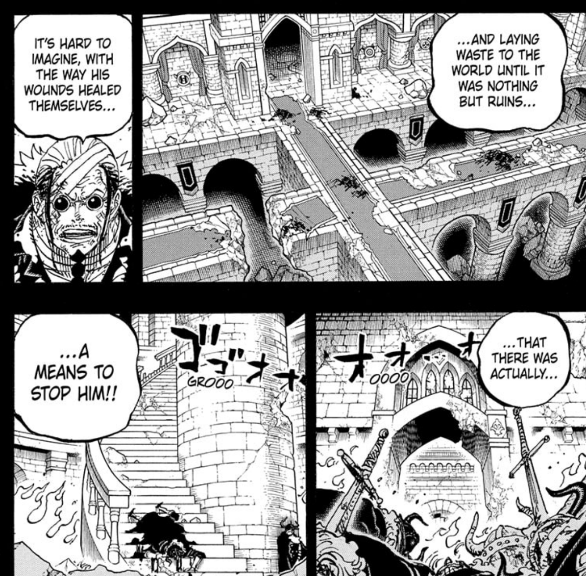 With the battle against Harald coming to a stop, and a snow still falls on Elbaph, we get to see Aurust Castle left in ruins. These ruins match those we saw the Straw Hats crossing in Chapter 1137, which much of the same damage matching the one seen back then. The following two shots also show the hall where Road walked through and the stairs he took after, and not only does the damage on the architecture match here too, but even the corpses littered on the ground, which then became skulls in those later shots.