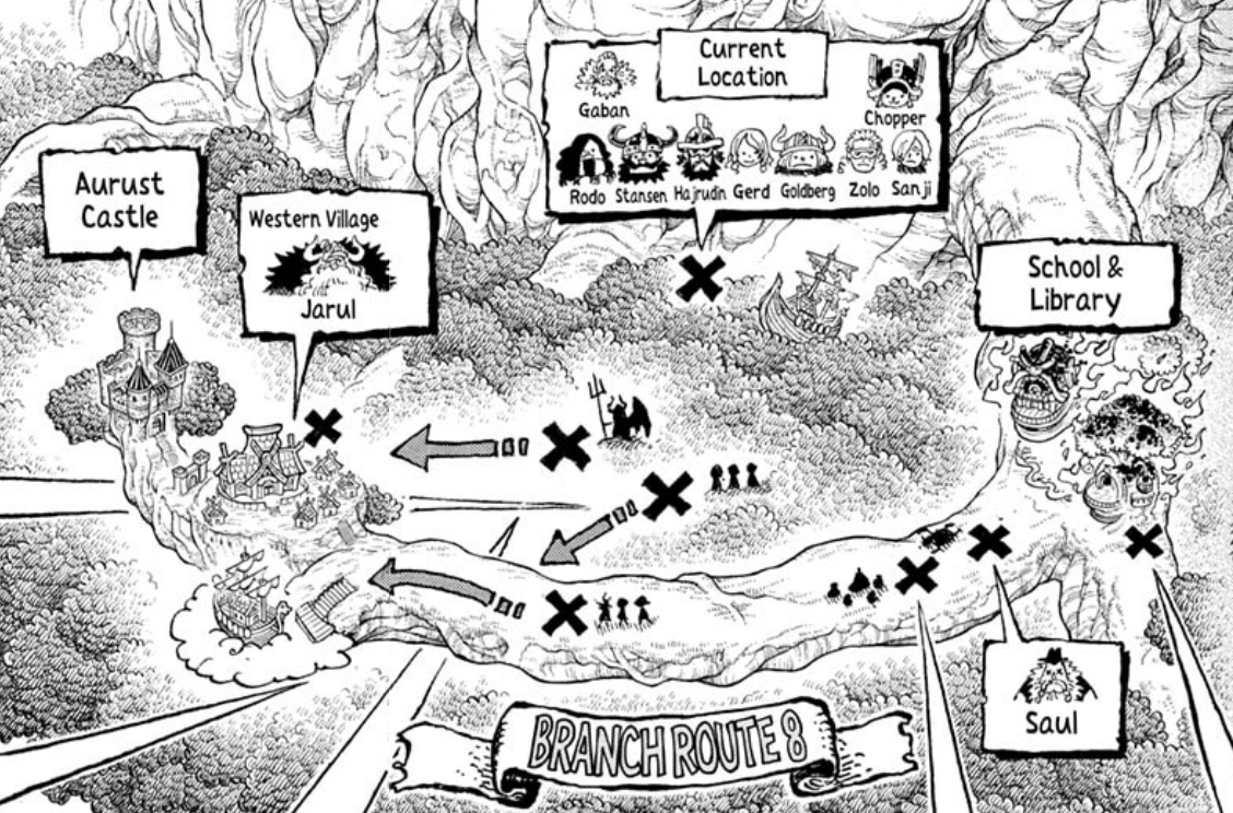 To orient ourselves on the map, the West Village lies on the western side of the Adam Tree, but that means that the left side of this map is north and the right side is south. All across the same branch is both the Warrior’s Spring, where the Owl Library and Walrus School are, whereas heading north at the tip is where the West Village (with Aurust Castle) is, and the location of the dock where the children are heading (if you remember, only those with the mark can use the Abyss, so the hostages must be taken to Mary Geoise by boat). In the middle next to the trunk is the lift from where we just came, with each of our groups splitting up.