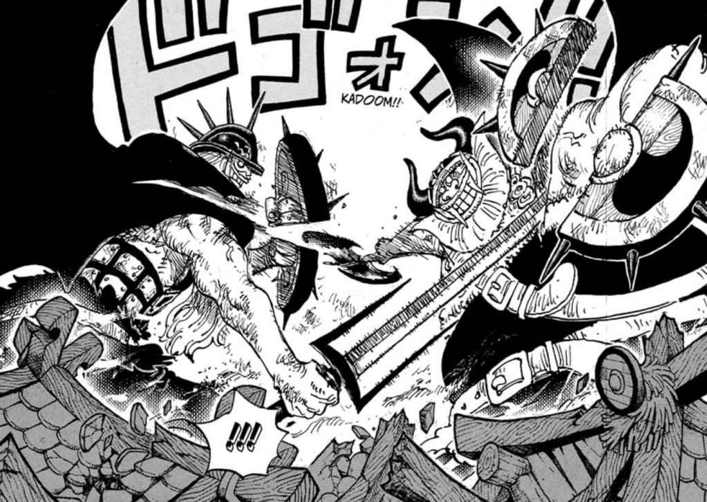 Dorry and Brogy try to attack Zoro but he dodges by creating a powerful gust of wind with his swords, which we’ve seen him use several times before such as when fighting against King to reorientate himself in mid-air. This causes Dorry and Brogy to slash each other, in a panel that is incredibly reminiscent of the one we first saw them dueling in Little Garden, with the only difference being that in this case they are cutting each other, but due to the effects of Domi Reversi they should regenerate, even if it may take a while given both of their enormous strengths. It would be quite funny if them clashing against each other would get them to get angry at one another and start hitting each other in spite of Imu’s orders while Mu is busy on the other side, essentially restarting their long feud at the worst possible time (for Imu, at least).