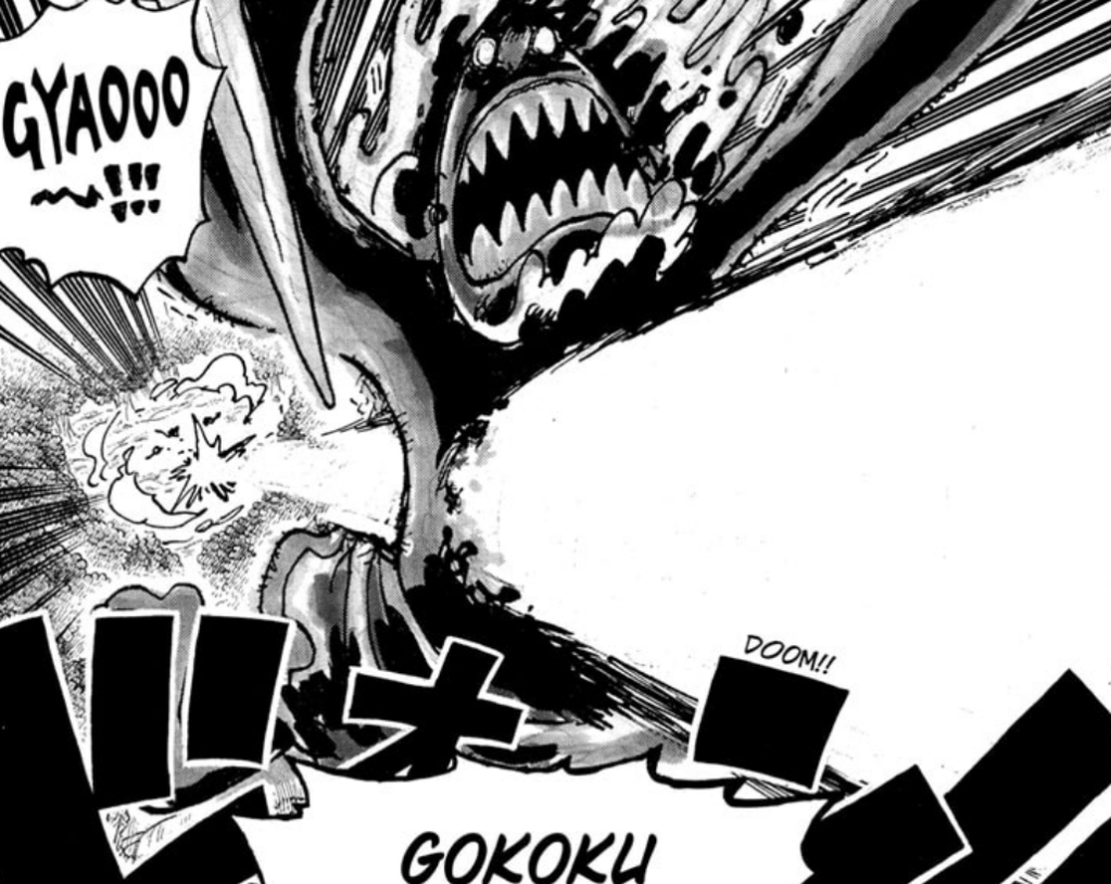 Meanwhile, while Sommers is leading the kids to the port, the mothers come in tow to rescue them. Beyond Ripley we also have Oimo, who one of the kids refers to as “grandpa”, which makes sense, as Oimo is already 153 years old after all. This lines up as if you recall in Chapter 1147, Oimo mentioned Olav being his grandson. A Nika MMA appears to fight them but they manage to stand their ground, as Ripley mentions that they are from a “generation of warriors”. This term actually harkens back to the start of the arc, where in Chapter 1134 Ripley mentioned how they were part of the last fading generation of warriors of Elbaph. To stop Nika, Gerd and Goldberg, alongside Road, unleash their own version of Hakoku. Instead of using Dorry and Brogy’s Hakoku (覇国, conquering nation) or Big Mom’s Ikoku (威国, Powerful Nation), they instead use “Goukoku” (轟国), which translates as “roaring country”. Indeed they let out a beam like a powerful roar or thunder, piercing straight through the MMA. Interestingly, they preface this attack with “sanshou” (三将), which means three generals, essentially meaning it’s a three way version of the traditional Elbaph attack.