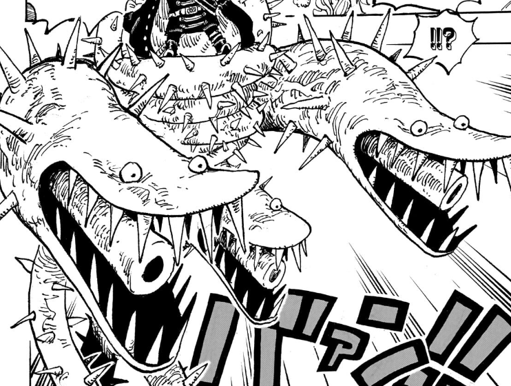 We get further proper context about the fruit from Jarul, who explains that indeed it is as assumed the Ryuu Ryuu no Mi (Dragon Dragon Fruit) Mythical Model: Nidhoggr. This transforms the user in the largest known dragon who is able to spew lightning, as indicated like we mentioned before by the kanji used for Nidhoggr before and in the chapter title here which reads as “lightning dragon” (雷竜), a trait Oda uniquely made up for the world of One Piece.