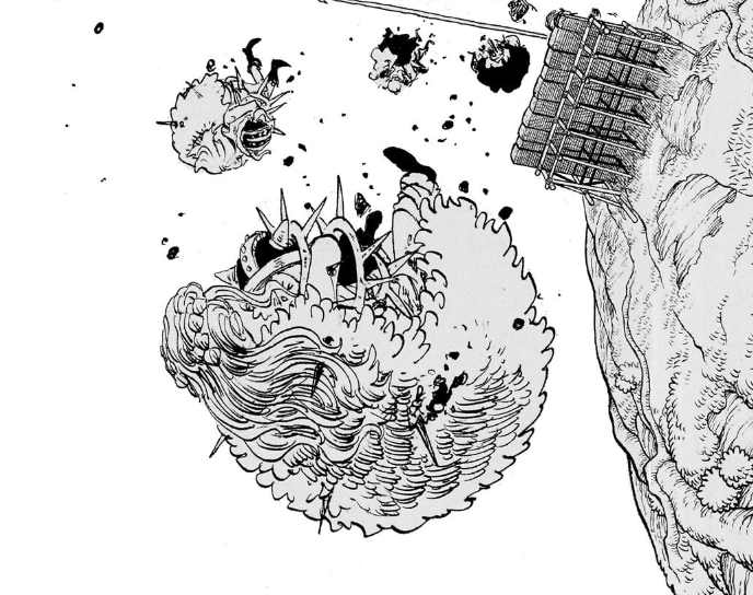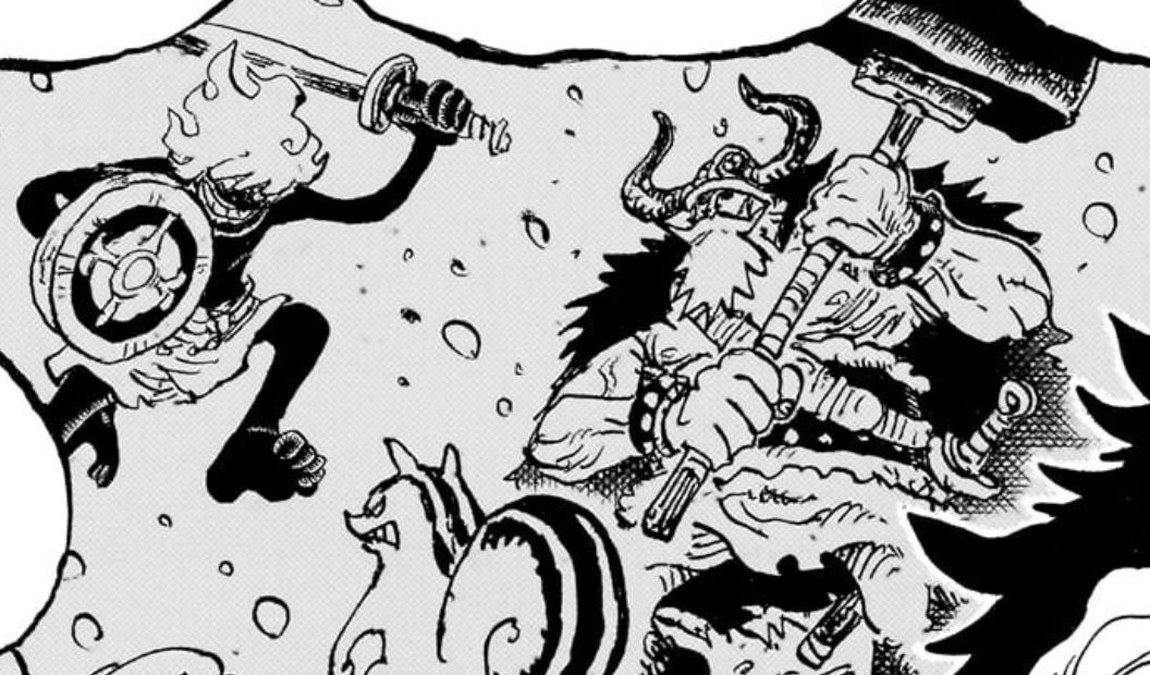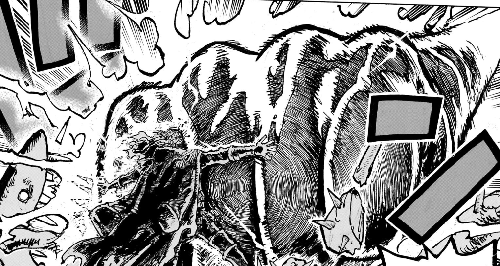 But not only does Zoro help as expected but so does Luffy, launching an attack he calls “Dawn Thor Rifle” (白い雷回転弾). Of course this is a combination of his line of Gear 5th “Dawn” attacks, with the kanji reading as “white”, whereas “Rifle” is his typical screw attack, with the kanji reading as “rotating bullet” (回転弾), just like his other Rifle attacks. On the other hand though here we have the addition of “Thor”, with the kanji reading “lightning” (雷) given the lightning bolt he included in the attack. The cool thing about this is that this isn’t the first time we’ve seen a Thor attack from Luffy, as his final move from the film Strong World was “Gomu Gomu no Gigant Thor Axe”, which was a version of Gomu Gomu no Axe that was not only in Gear Third but also lightning charged from a storm. And while the movie isn’t canon, it was still written by Oda, so it’s cool to see him bring this attack back here, especially in a setting like Elbaph where the mention of “Thor” is incredibly thematically appropriate. This isn’t the first time it’s appeared in canon either, as Luffy did use a Gomu Gomu no Thor Elephant Gun against Chinjao in the Corrida match. You can even appreciate the spinning nature of the attack in the way that Oda draws it where you can see the whole fist is drawn with multiple circles to simulate that spinning effect.