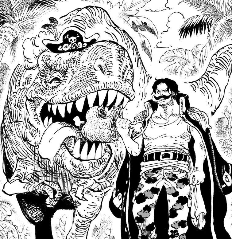 On the cover, we see Roger feeding a T-Rex like a puppy. Gabin did previously mention them having visited Little Garden, so Roger already has a history with dinosaurs and I wouldn’t be surprised if he had interacted with one like this in the past. What’s interesting is that the Roger in this cover is a Roger at a point in life between the events of God Valley but before the Oden flashback. He still looks a lot like Ace, but he’s finally grown out his mustache. He is now using his now pirate hat, having passed on the straw hat to his son Shanks, but again he doesn’t look quite as old as when he met Oden. So it’s interesting to see a Roger from a period of time we didn’t get to see much of him, from the ages of 39 to 52. We did get a very brief glimpse of him at age 47 during the Oden flashback when he first heard of Oden in the news, but that’s all we saw from that period of his life.