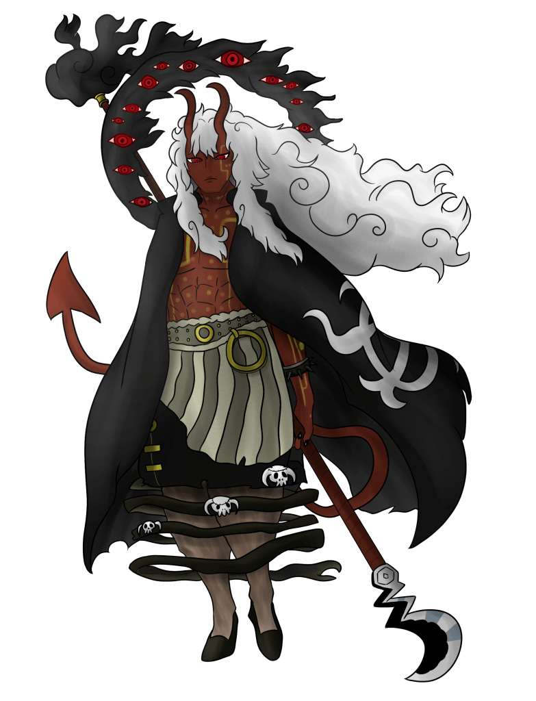 Interestingly Imu’s legs appear to be quite puffy, which could be a set of baggy pants like those of Enel, but at the same time also reminds me of the legs of a goat, like a satyr, similar to the depictions of many demons in common folklore. His hand also appears to be wearing a spiked bracelet, tying into the overall demonic appearance. Just in general Imu’s appearance is incredibly reminiscent of that of the Devil from so many cultures. There’s European motifs of horns, red skin, or goat-like details, but also eastern motifs reminiscent of not just sun wukong, but also hinduist devils or the demons of Japanese folklore. If anything this design feels like the accumulation of every single myth of the devil from all of human folklore. In different religions, in different cultures, in different folklores, there’s often been a concept of the “devil”. Call him Satan, Lucifer, Iblis, Beelzebub or Mara, the concept of an incarnation of evil has existed across all of mankind, and those dreams and fears likely took the form of what we see here, the devil fruit itself. If people’s dreams and their wishes to be freed from oppression led to the existence of the Nika fruit, perhaps their fears and their desire for control led to the existence of the devil fruit, humanity’s desire to be controlled by the one who stands at the pinnacle of the world.