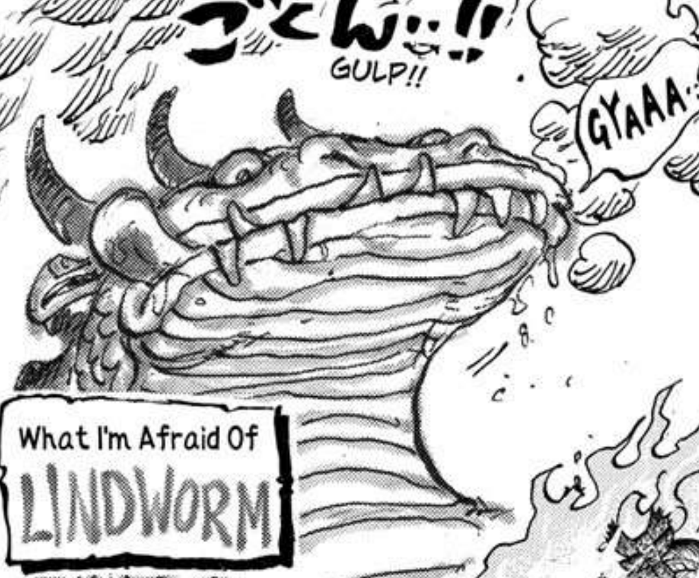 Anyway, in this case, the lindworm is not only distinguishable by its name, but also the kanji reading that Oda uses for it. The lindworm reads as “hebi ryuu” (蛇龍), which means “snake dragon” due to its more serpentine shape. Interestingly though, here Oda uses the kanji for “eastern dragon” despite the lindworm being a creature from western mythology. However, given how in One Piece western dragons are generally associated with the large winged kind like the nidhoggr, while eastern dragons are more associated with the wingless serpentine kind like the seiryuu, it makes sense that Oda would associate the lyndworm being in the latter category, despite it originating in western mythology.