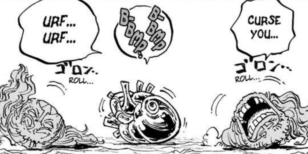 Outside the village, Sommers’s remains, destroyed by Loki, try to put themselves back together. Interestingly, what seems to be Sommer’s heart can be seen beating on its own, so I wonder if Loki didn’t finish off Sommers well enough like he did with Harald but may have been close. Oddly enough though, this heart appears to be a bit bizarre, seeming to be black or shiny in some form. We’ve seen hearts before in One Piece when Law took out the hearts of other users, and they looked like fairly regular organs back then, which makes it more comparable to now with how bizarre looking this one is.