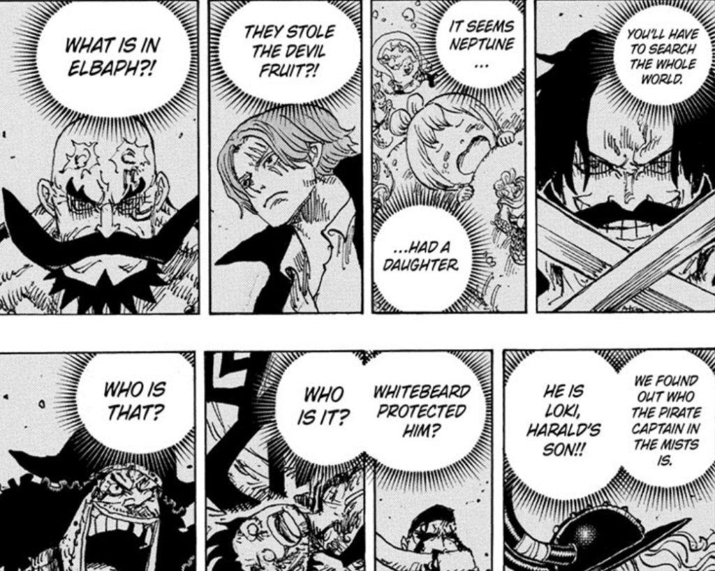 On one hand, going far back, chapter 1167 showed that some 33 years ago, Harald was working for the Government by secretly destroying pirate ships within deep mists. This fits the description Imu gave, but obviously it’s not this supposed entity because Imu describes it as attacking Government ships and their identity remaining unknown. There is a potential for parallel that both father and son ended up doing similar activities, just for opposite sides of the Government, which could be a potentially powerful thematic throughline, but it falls apart quite fast. What matters most however is that at the time, Oda specifically had characters bring up the Florian Triangle and they distinctly said that no, this was not in the Florian Triangle, as sailors did not dare go to that area. Unless Oda is doing some really poor misdirection, this would imply that the entity was already active at that period of time. Long before Loki ate the fruit, when it was still sitting in a chest within the castle and Loki was still chilling with Ida.