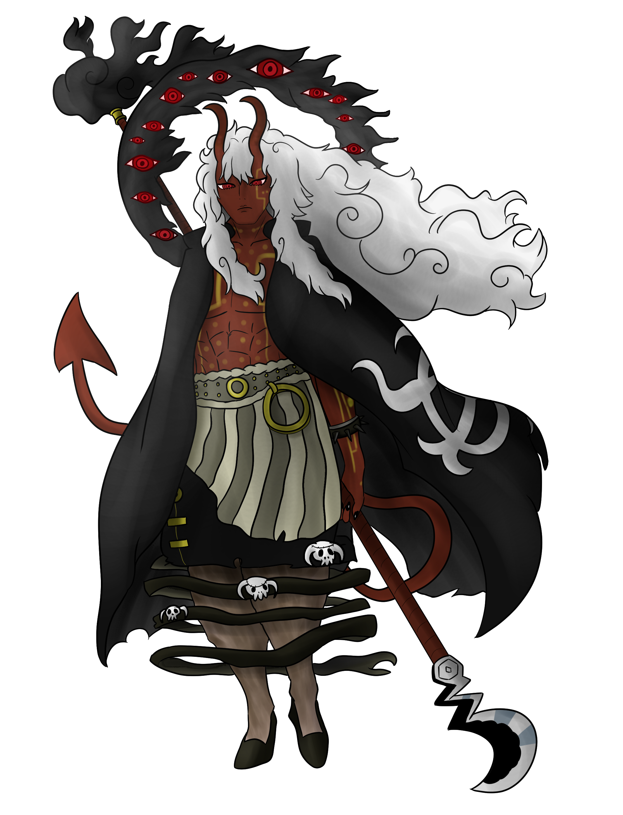 From the hair of course we have sprouting two devil-like horns, and behind Mu is a hagoromo cloud scarf, although this one is quite unique as it has the symbols of Imu’s eyes on it. Imu appears to be barechested, which would seem to suggest, despite the more feminine beauty side of the face, that Imu may be a man. We know that Saint Nerona Imu was supposedly a man as “Saint” was used exclusively for male Celestial Dragons, while female use a different title, but there was some question as if to Imu’s current body was still that of a man. Regardless, Mu’s skin appears to be largely covered in what seem like marks, which are reminiscent of the kind of marks you’d see on a satanic circle but also have a slightly technological look to them, almost like a motherboard. The nails also appear to be painted, though rather than being painted by hand I think it’s more likely that they are dark claws like those of a devil, particularly as they appear to be sharp.