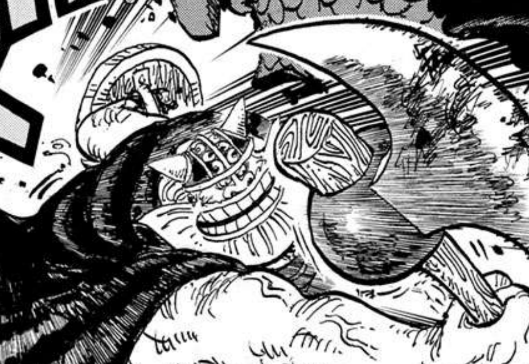 And thus, the whole trio unleashes a series of powerful attacks. First, Franky unleashes a new variation of “Strong Right” called “Super Strong Dexter” (スーパーストロングデクスター). The word Dexter here reads with the kanji for “right” (右), as “dexter” is an older word associated with the right hand, which is where words like “ambidextrous” come from. Jinbe unleashes “Gyojin Karate Ougi Buraikan” (魚人空手「奥義」武頼貫), or “Fish-Man Karate Secret Technique: Vagabond Drill”, which Jinbe previously used against Wadatsumi in Fish-Man Island. “Buraikan” is a word which here is just a bunch of kanji meaning “piercing martial art drill”, but “buraikan” phonetically usually refers to an outlaw, hence its localized name. Finally, Sanji uses “Ifrit Jambe Concassé”, which is an ifrit jambe version of concassé, the iconic move he’s used since defeating Satori in Skypiea. The kanji for Ifrit Jambe, like before, read as “majin leg style” (魔神風脚), since the ifrit is a majin, or djinn, whereas also like before, concassé’s kanji reads as “coarse crushing” (粗砕), the cooking technique that is called in french as “concassé”.
