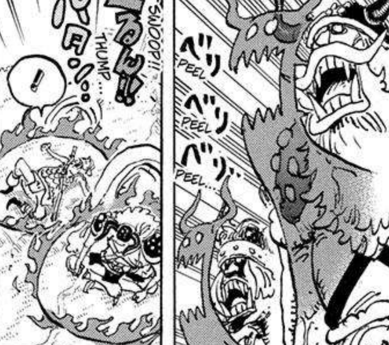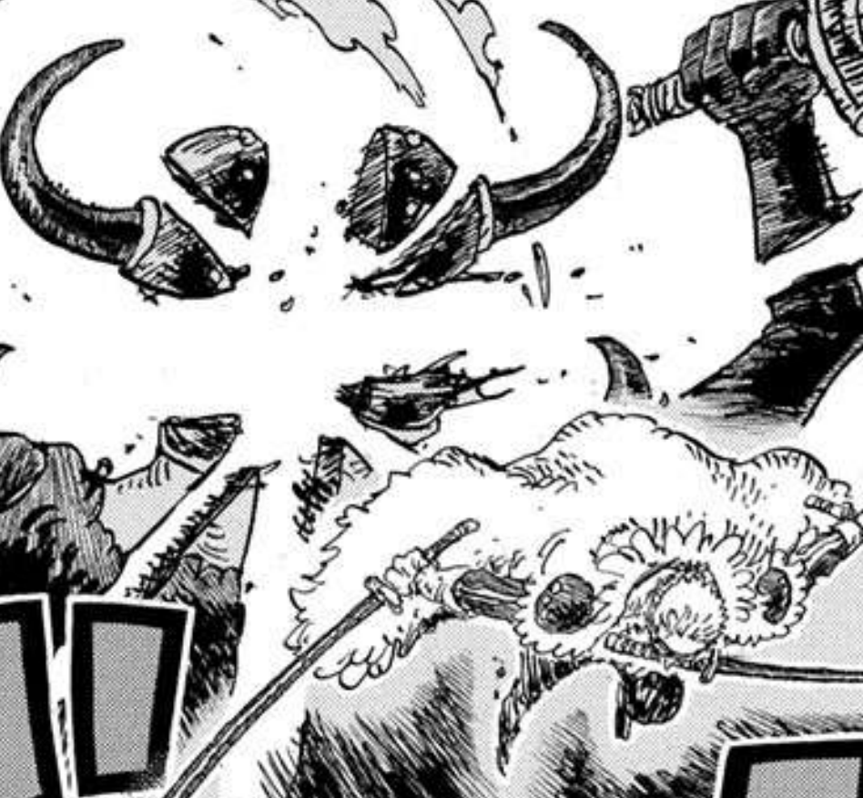 After Luffy gets scolded, Usopp joins Brook’s side to try and stop Imu possessed Gunko, but inevitably can’t manage to put much of a dent. Interestingly, she appears to hit Brook at a distance simply by extending her palm, making some sort of cracking sound effect. This attack seems very similar to the same move that Saturn used at Egghead, where he could harm others simply by gazing at them. We assumed that to be one of the powers of the Gyuuki, as legend says it can hurt others through its gaze. But I wonder in this case if this was a power extended by Imu or if alternatively this is a separate but similar power which allows Imu to simply hit at a range. If that is the case, then I wonder what the specifics of it are. Usopp tries to fight back by using a Skull Blastgrass, but interestingly he already tried using it against Gunko to no effect before, so I suppose more than expecting it to work he was just trying to make a statement. You’ll also notice that the infamous shield that supposedly parried Imu has been completely eviscerated, so I suppose it really didn’t tank that attack beyond a split second.