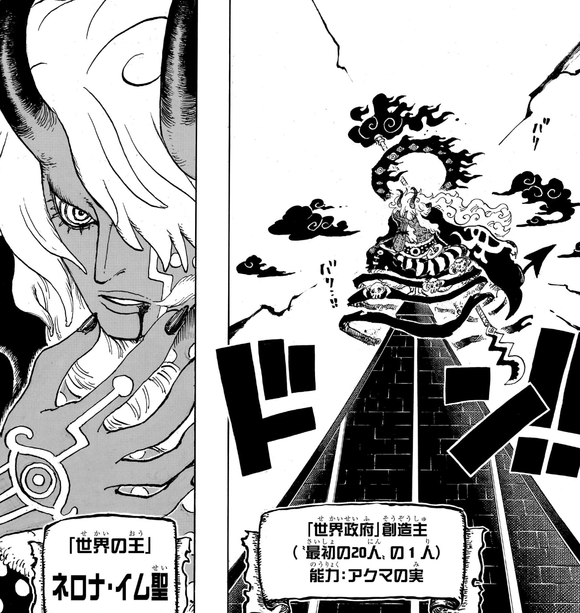 Particularly in Japanese, the word “ability” is written as “nouryoku” (能力). In One Piece, this word has always been used to refer to devil fruit users, who are referred to as “ability users” (能力者), so Oda is inferring an ability as in a devil fruit power. But instead of being a traditional devil fruit, the name listed here instead is that of “akuma no mi” (アクマの実), or literally just THE devil fruit. What is interesting is that akuma, meaning devil, is usually written with kanji in One Piece (悪魔), but in this case here it’s written with phonetic katakana. This is because all devil fruits have always been written with phonetic katakana (the name part at least, “fruit” still retains its kanji). So for example the Inu Inu no Mi, or Dog Dog Fruit, doesn’t really use the kanji for “dog” but rather just the phonetic “inu inu”. In this case “akuma” is also written phonetically to follow the pattern of devil fruits, which is also how Japanese readers can distinguish from “akuma no mi” in kanji (meaning all devil fruits in general) and “akuma no mi” in katakana (meaning Imu’s fruit in particular). The bizarre thing however is that all devil fruits have a very specific pattern of being composed by two kana in repetition, like gomu gomu, inu inu, bomu bomu, etc. This is because Japanese loves using two kana repeated to represent many sound effects or expressions, such as sube sube meaning silky smooth or mero mero meaning madly in love, so Oda extended this pattern to all fruits because it sounded cool. But in the case of this “akuma no mi”, it breaks all previous rules aside from being written in phonetic katakana. Akuma here is a single word, it’s not the aku aku no mi, it’s the “akuma no mi”, and furthermore a-ku-ma is three kana syllables rather than two. This goes to show how this power truly is above all others and works differently than other fruits. I wonder if by extention things like the fruits of the Gorosei are also similar to this where it’s just the “Gyuki no Mi” for someone like Saturn rather than the Kumo Kumo no Mi (Spider Spider Fruit), Mythical Model: Gyuki.