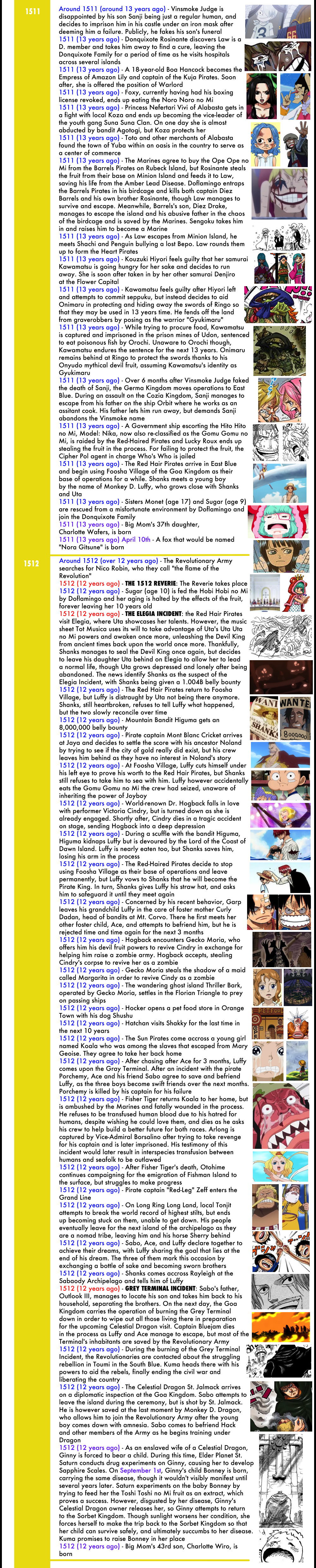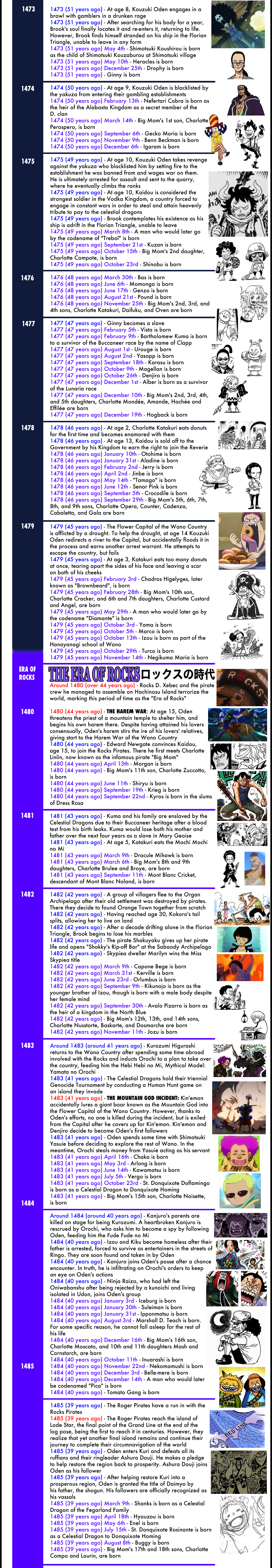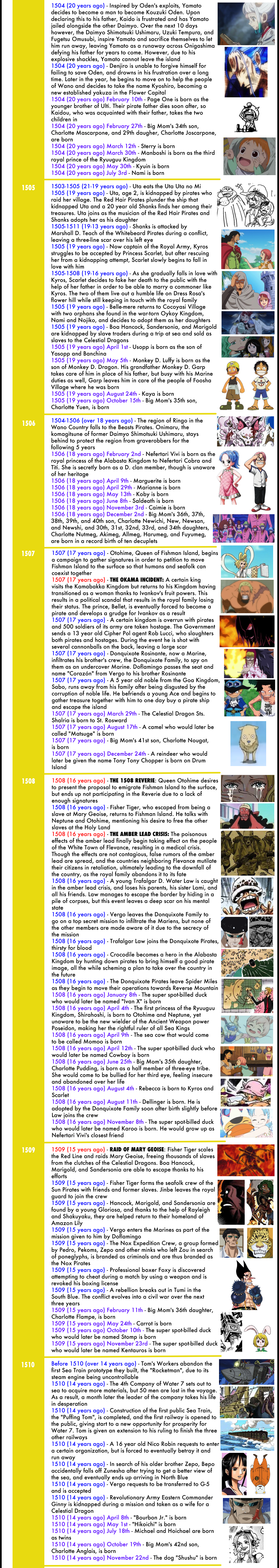 The One Piece Timeline is one of the biggest projects I have ever worked on, hundreds of hours in the making, meant to serve as a comprehensive chronology of the entire history of the One Piece world date by date. I have been working on and updating this Timeline since 2015, and I believe it is the most comprehensive One Piece Timeline available on the internet. So that it can serve as a document of reference for your research, an entire bibliography is attached beneath the graphic, with reference notes to every single date and where it was derived from. Please feel free to use this Timeline for whatever you need, just credit me if you showcase it in full!